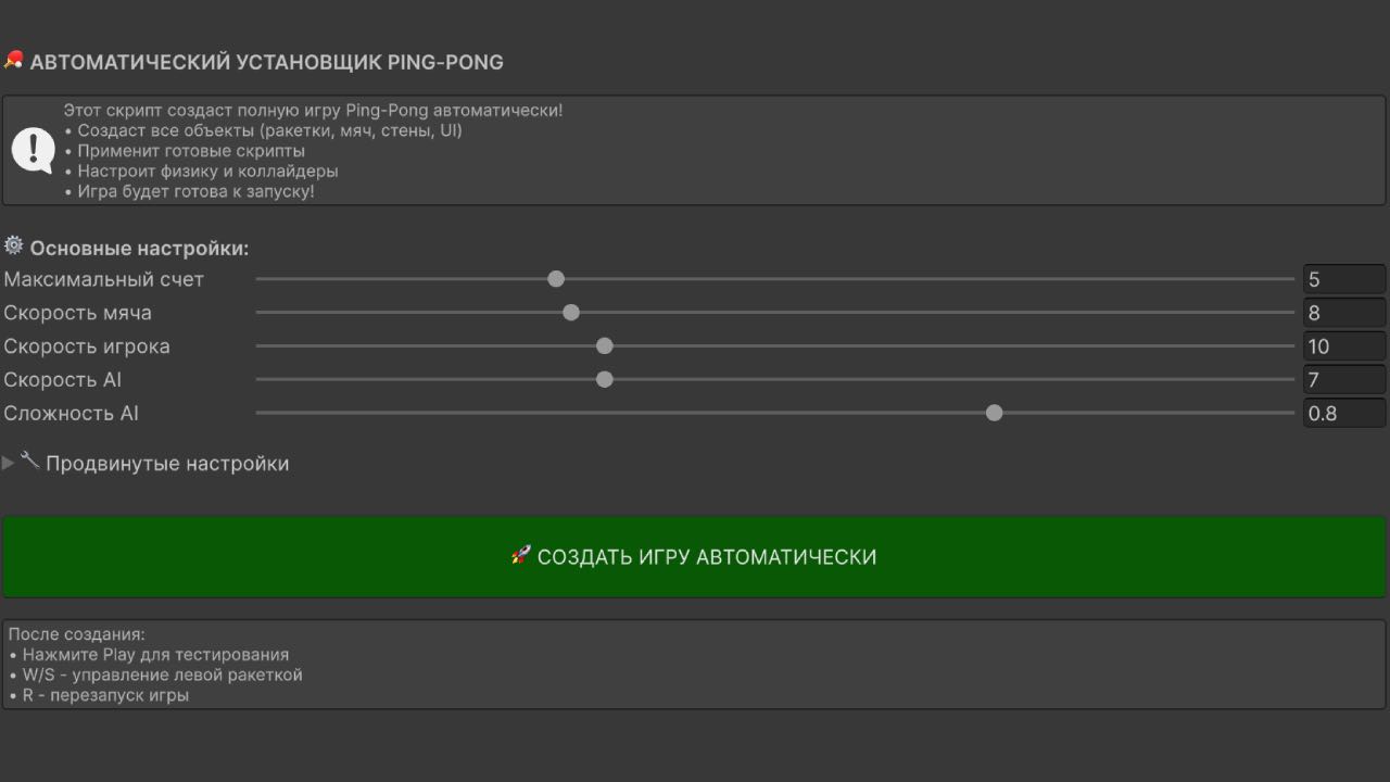 Я уточнил, что вручную создавать ничего не хочу. После этого он создал PingPongGameSetup.cs с автоматическим установщиком. Остаётся создать сцену и запустить скрипт, остальное установщик создаст сам: